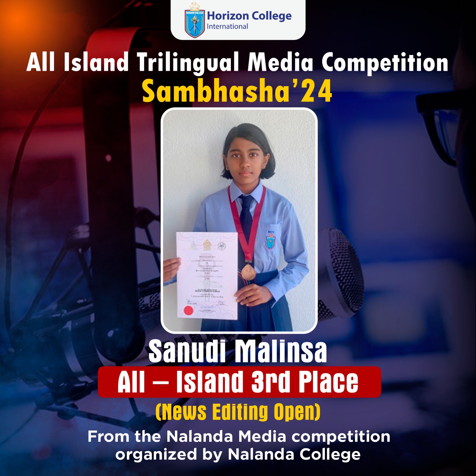 A big shoutout to Sanudi Malinsa for achieving the All-Island 3rd Place in the News Editing (Open) category at Sambhasha’24 Trilingual Media Competition!