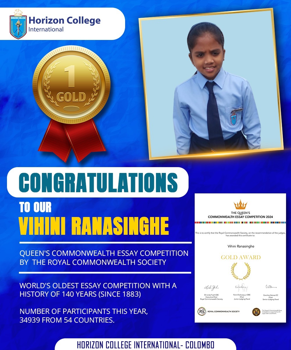Congratulations to our brilliant student Vihini Ranasinghe on winning the Gold Award 🥇 at the Queen’s Commonwealth Essay Competition 2024 hosted by The Royal Commonwealth Society. This prestigious competition is the world’s oldest essay competition with a remarkable 140-year history (since 1883) and saw participation from 34,939 students from 54 countries this year.