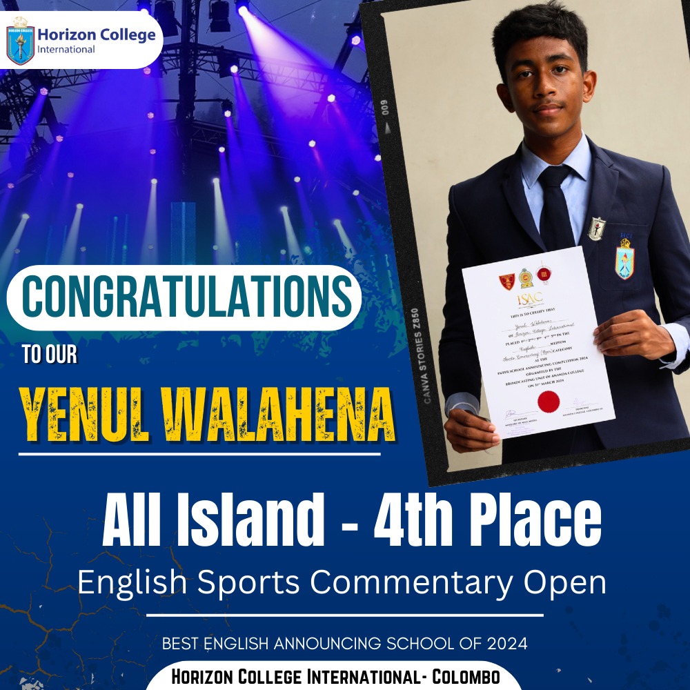 A massive congratulations to Yenul Walahena for earning 4th Place in the All-Island English Sports Commentary Open!  Your talent and dedication have truly shone through, making Horizon College International – Colombo proud once again.