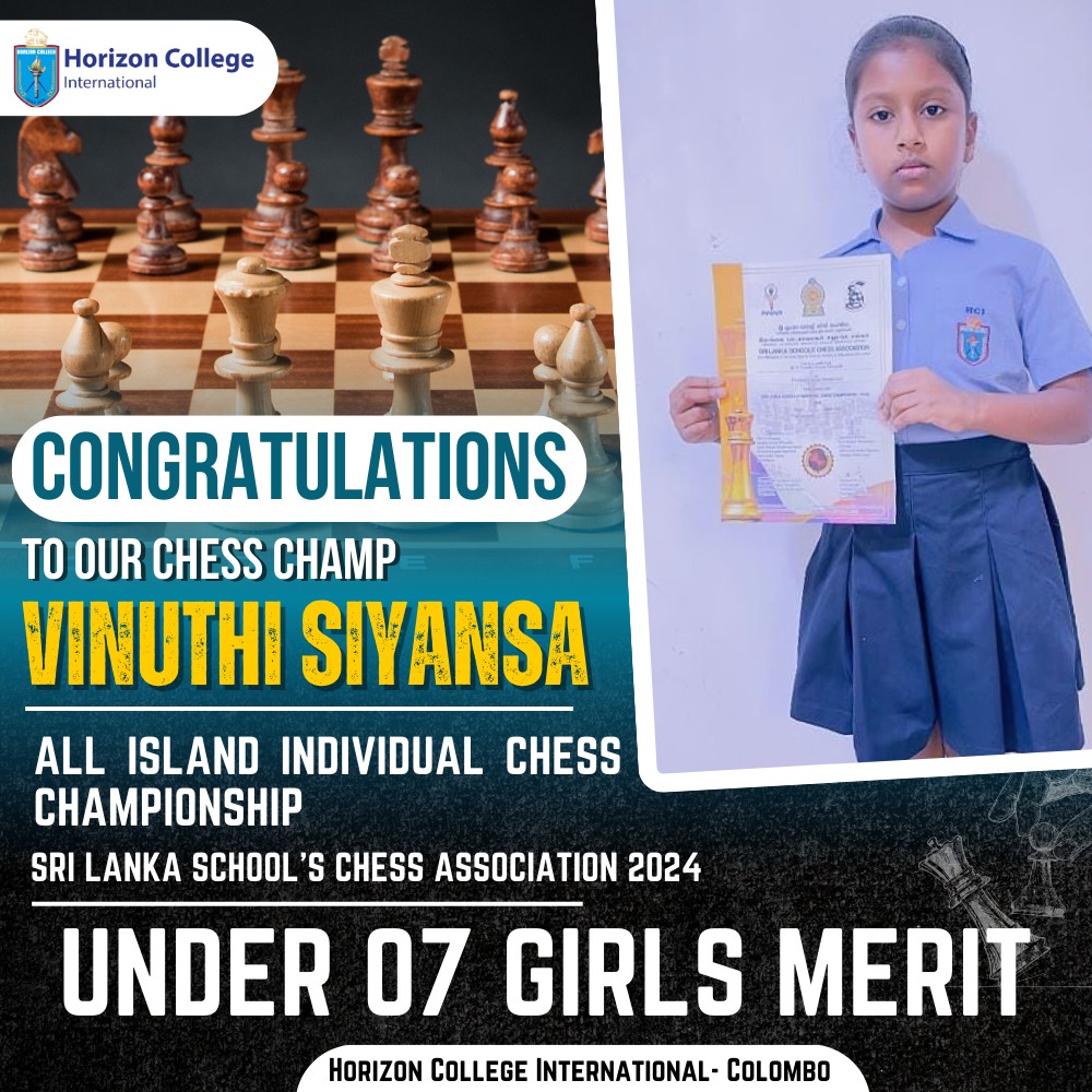 We’re thrilled to celebrate Vinuthi Siyansa from Horizon College International for her fantastic accomplishment in the All Island Individual Chess Championship 2024! At just 7 years old, Vinuthi has earned the Under 07 Girls Merit title, showcasing her remarkable talent and dedication to the game!
