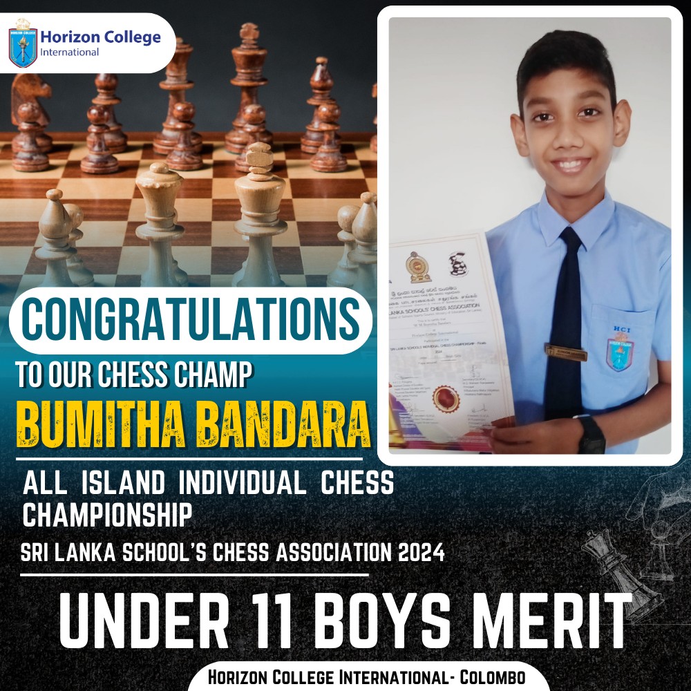 We are incredibly proud of Bumitha Bandara from Horizon College International for his outstanding achievement in the All Island Individual Chess Championship 2024! He secured the Under 11 Boys Merit title, showcasing his strategic skills and dedication.