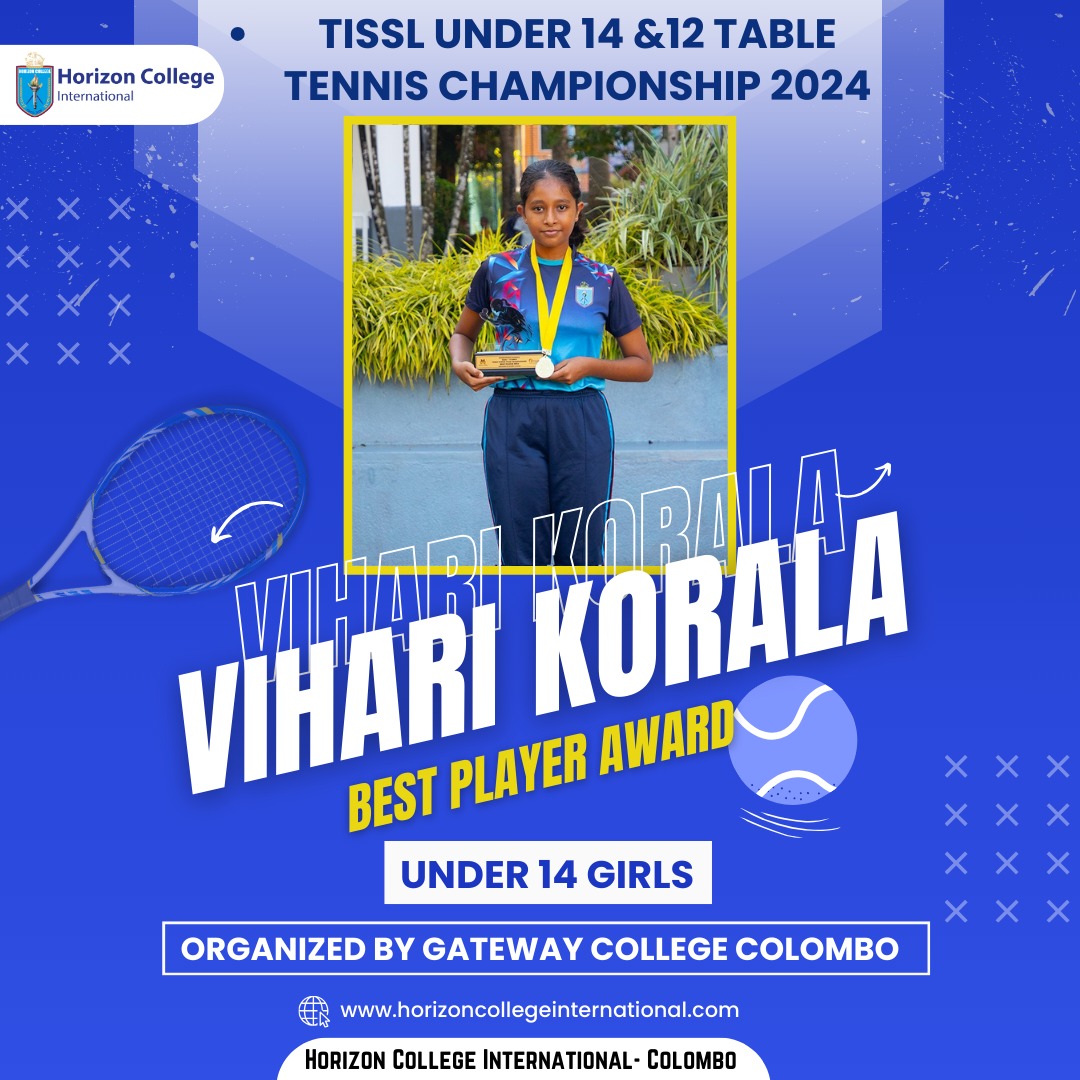 We are thrilled to announce that Vihari Korala from Horizon College International has won the Best Player Award in the Under 14 Girls category at the TISSL Under 14 & 12 Table Tennis Championship 2024, organized by Gateway College Colombo!