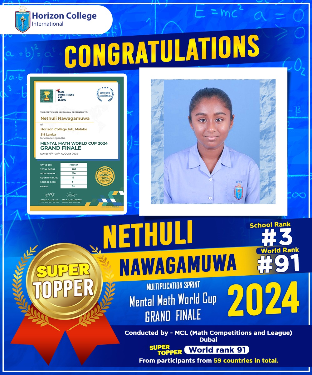 Nethuli has achieved a remarkable feat in the Mental Math World Cup 2024 Grand Finale! Competing with participants from 59 countries, she has earned the prestigious title of Super Topper in the Multiplication Sprint with an incredible World Rank 91 and School rank 03!