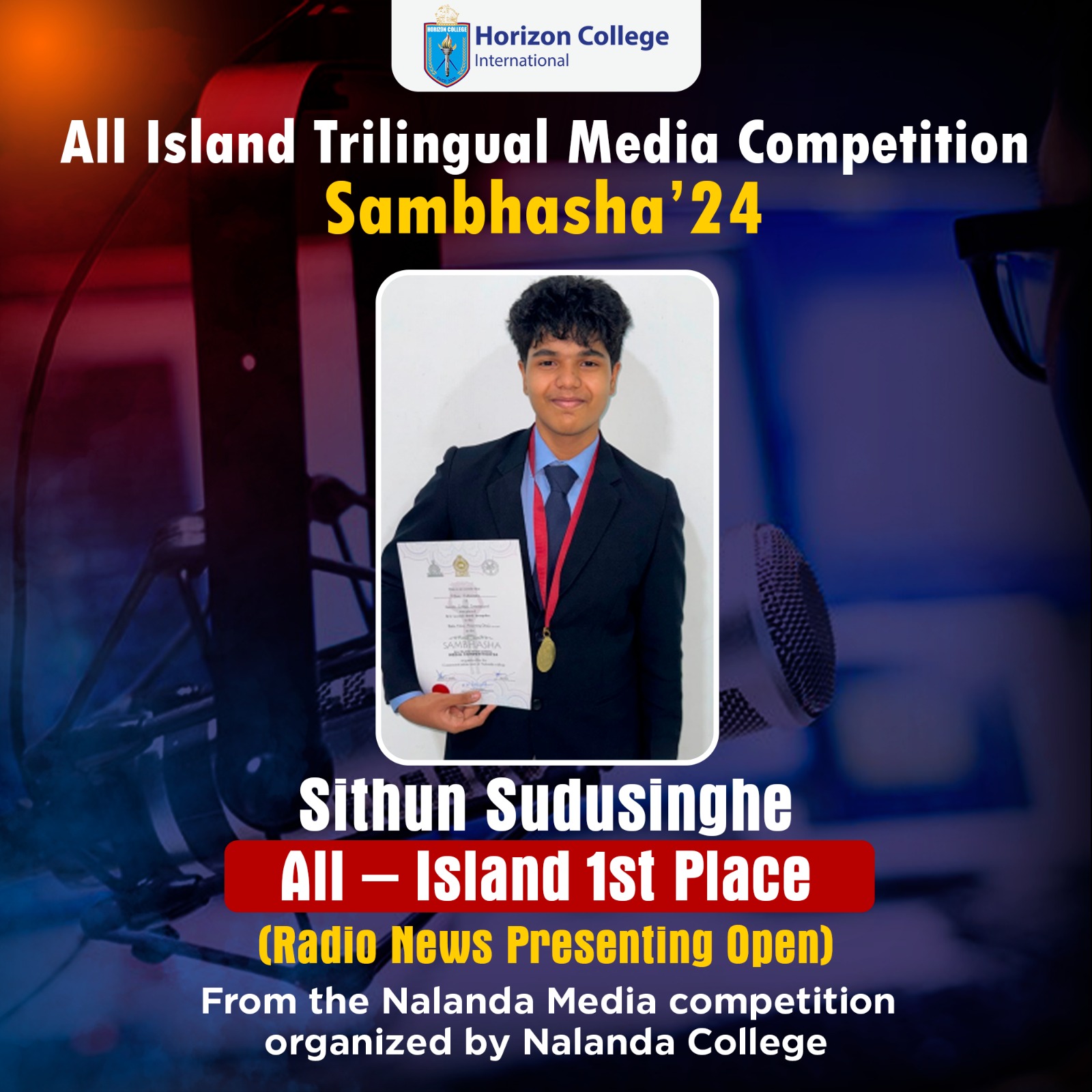Sithun has achieved the All-Island 1st Place in the Radio News Presenting (Open Category) at the esteemed All Island Trilingual Media Competition – Sambhasha ‘24!